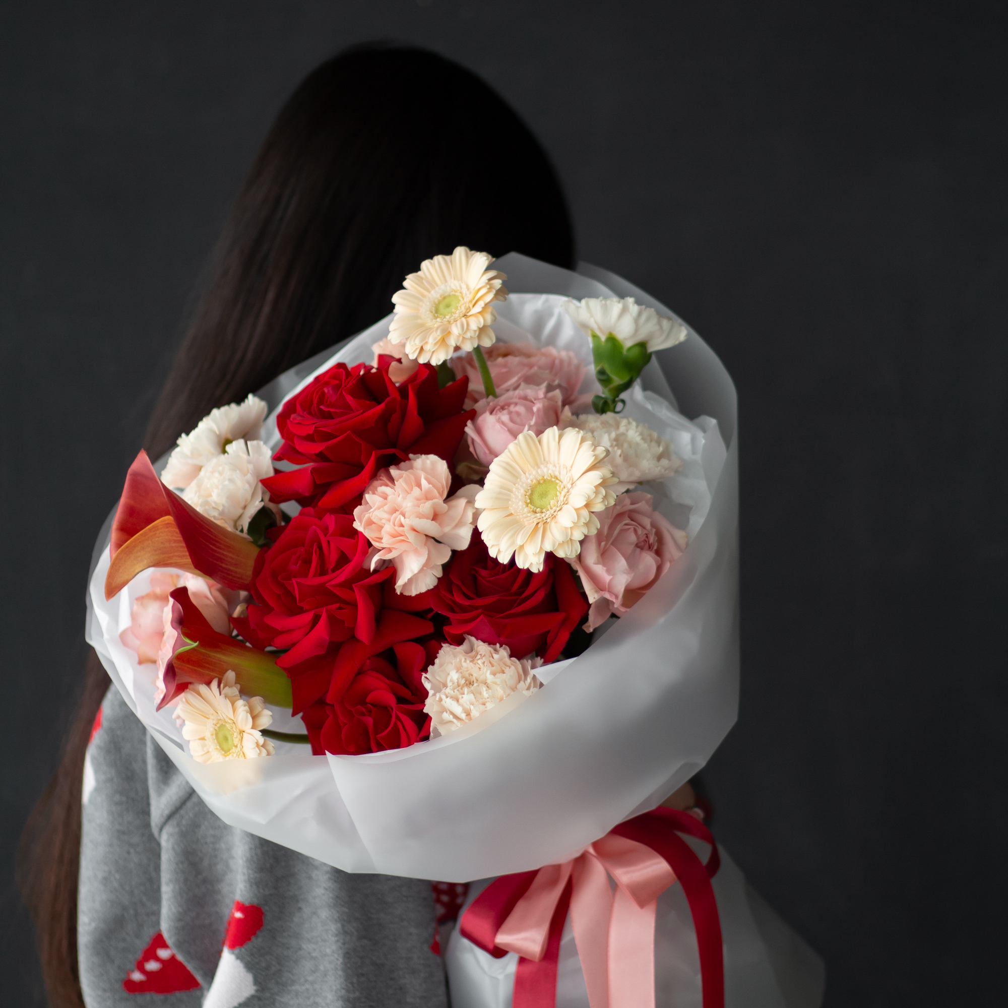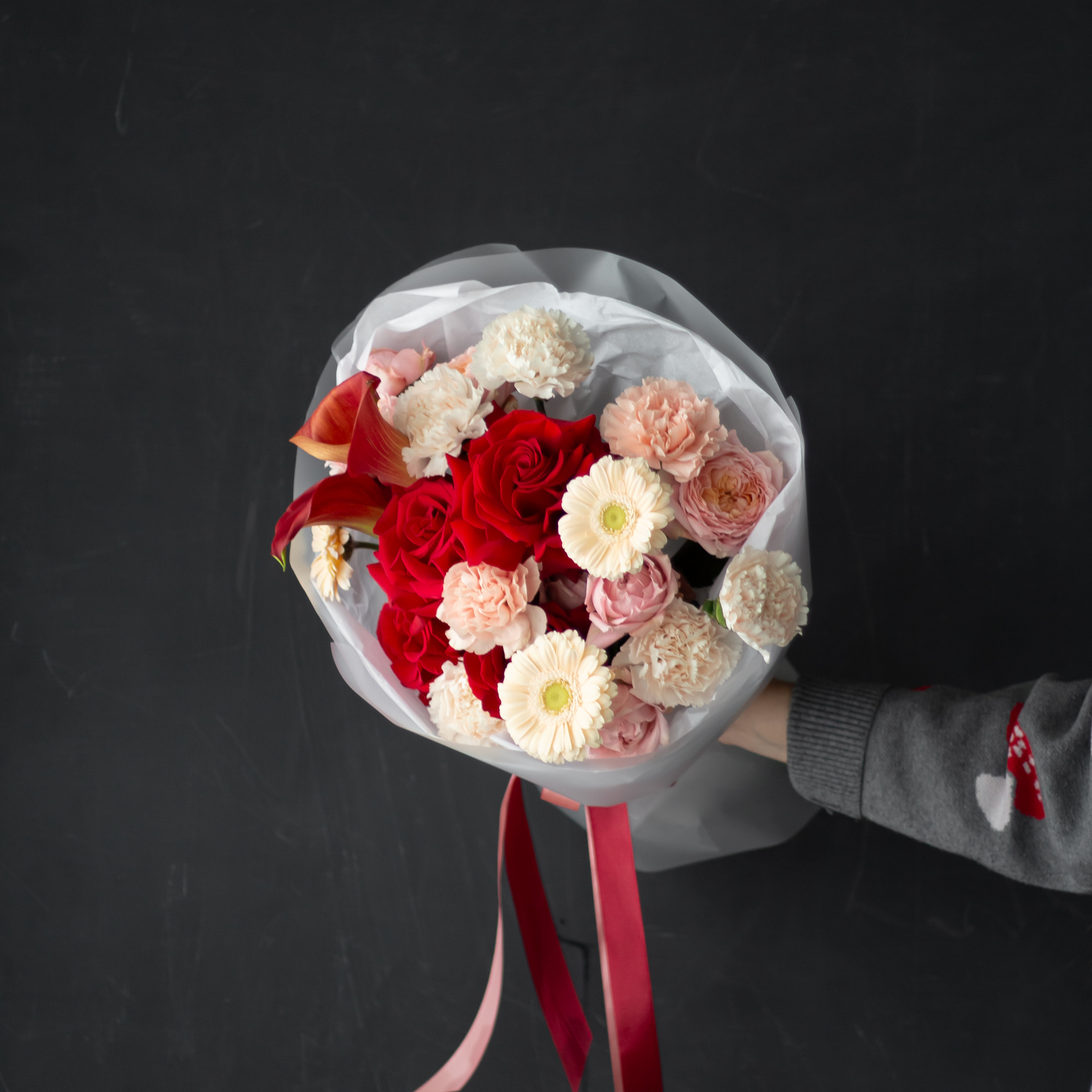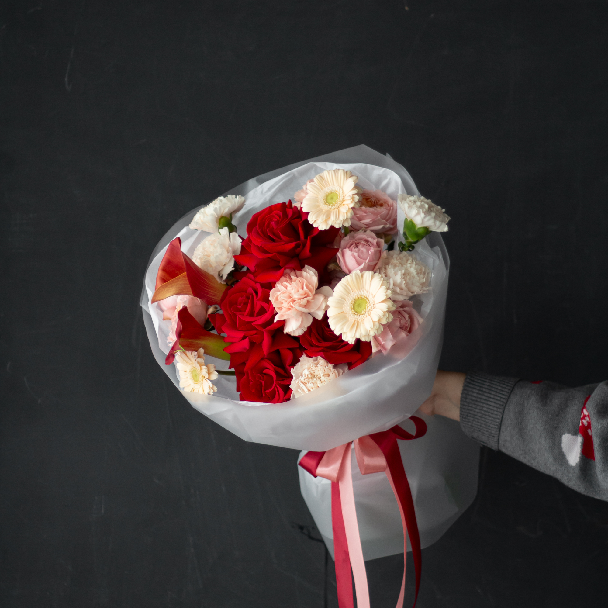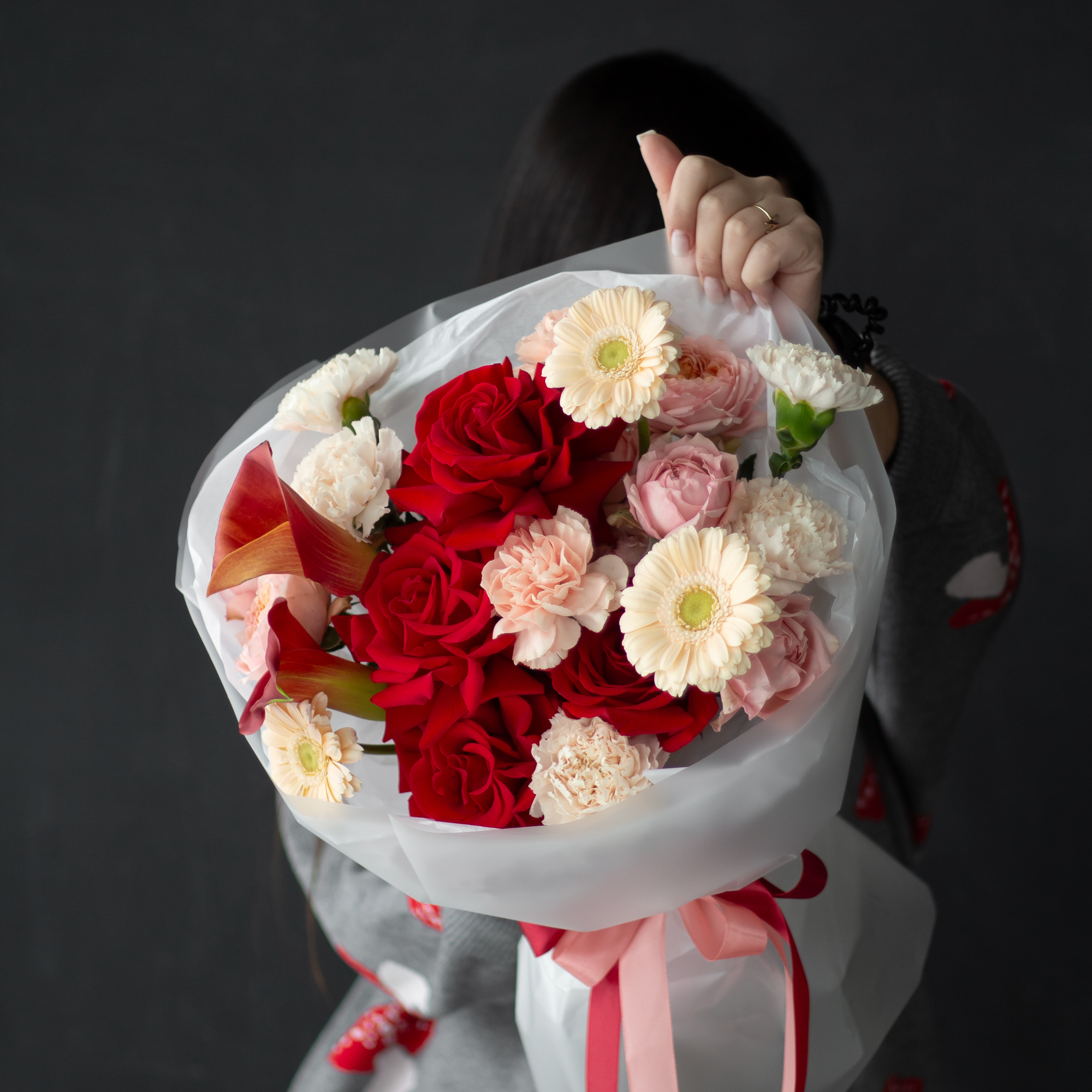 гвоздики, герберы, каллы, пионовидные кустовые розы, розы