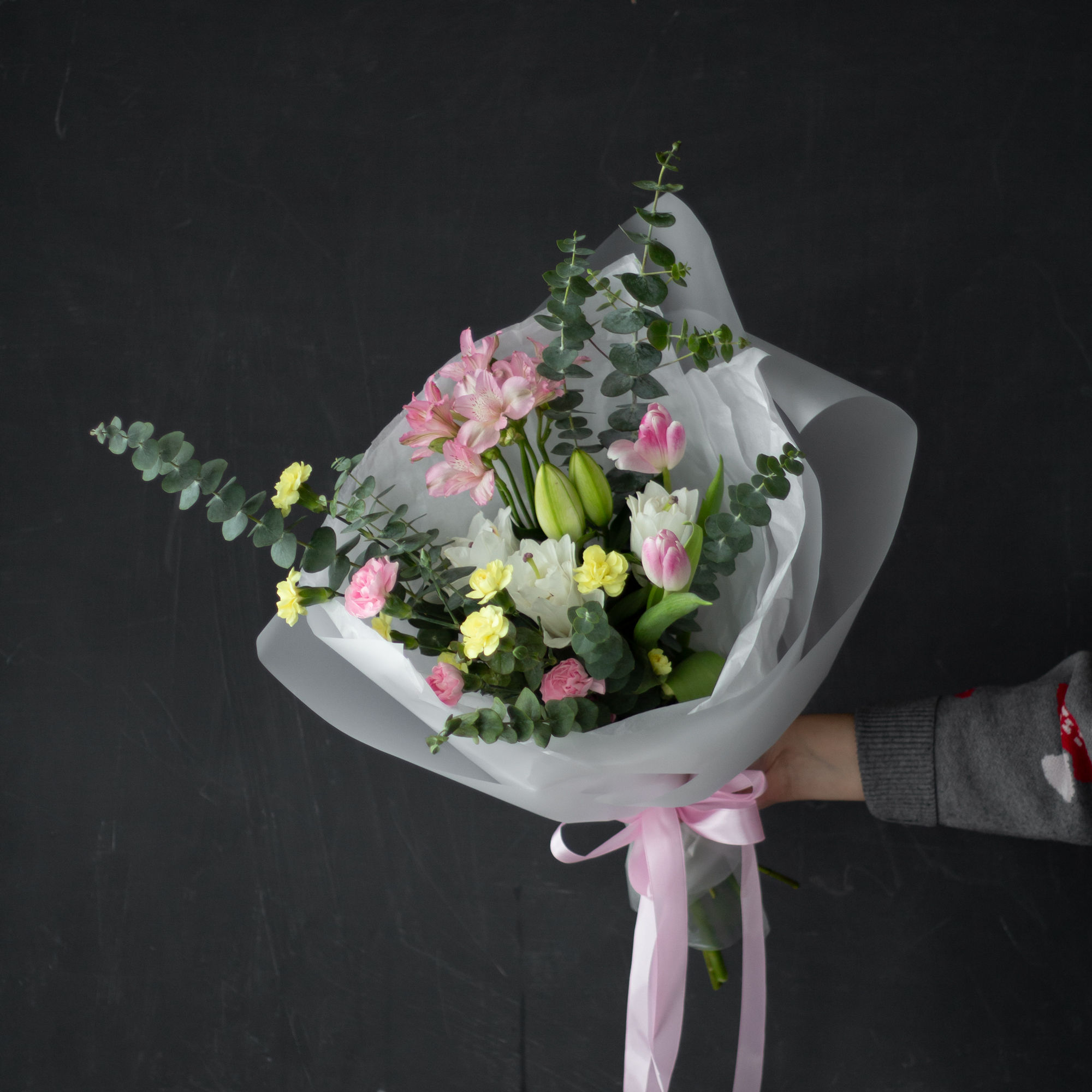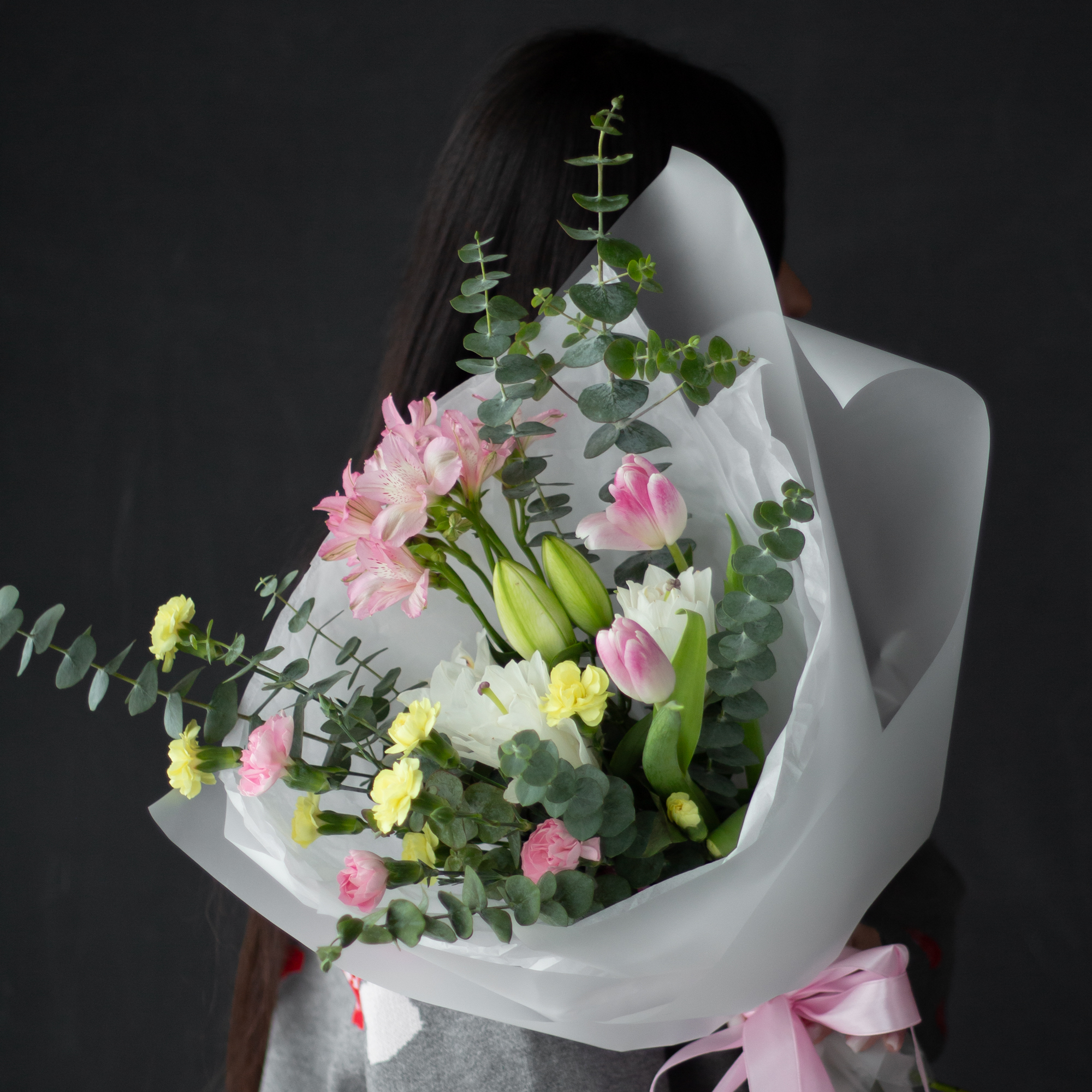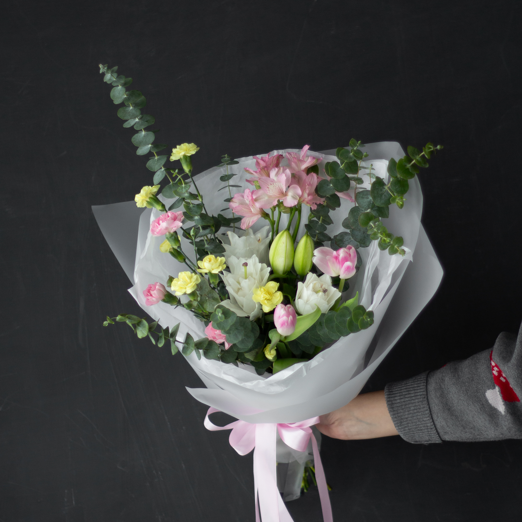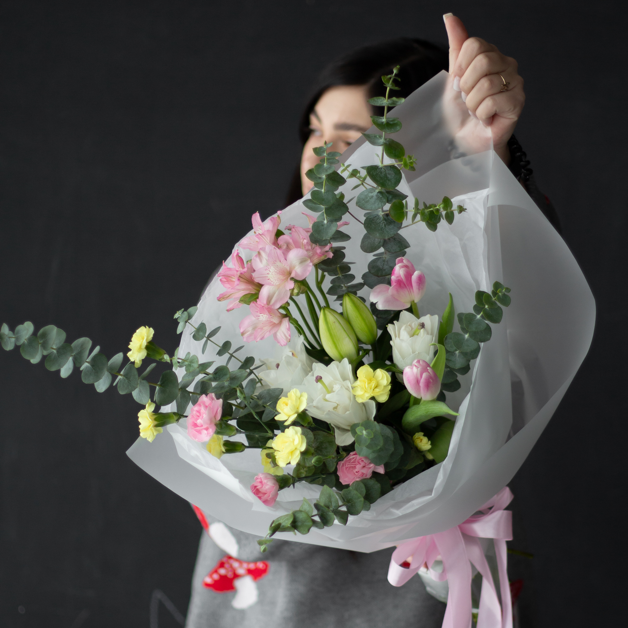 Авторский букет с лилией , тюльпанами и альстрамерией