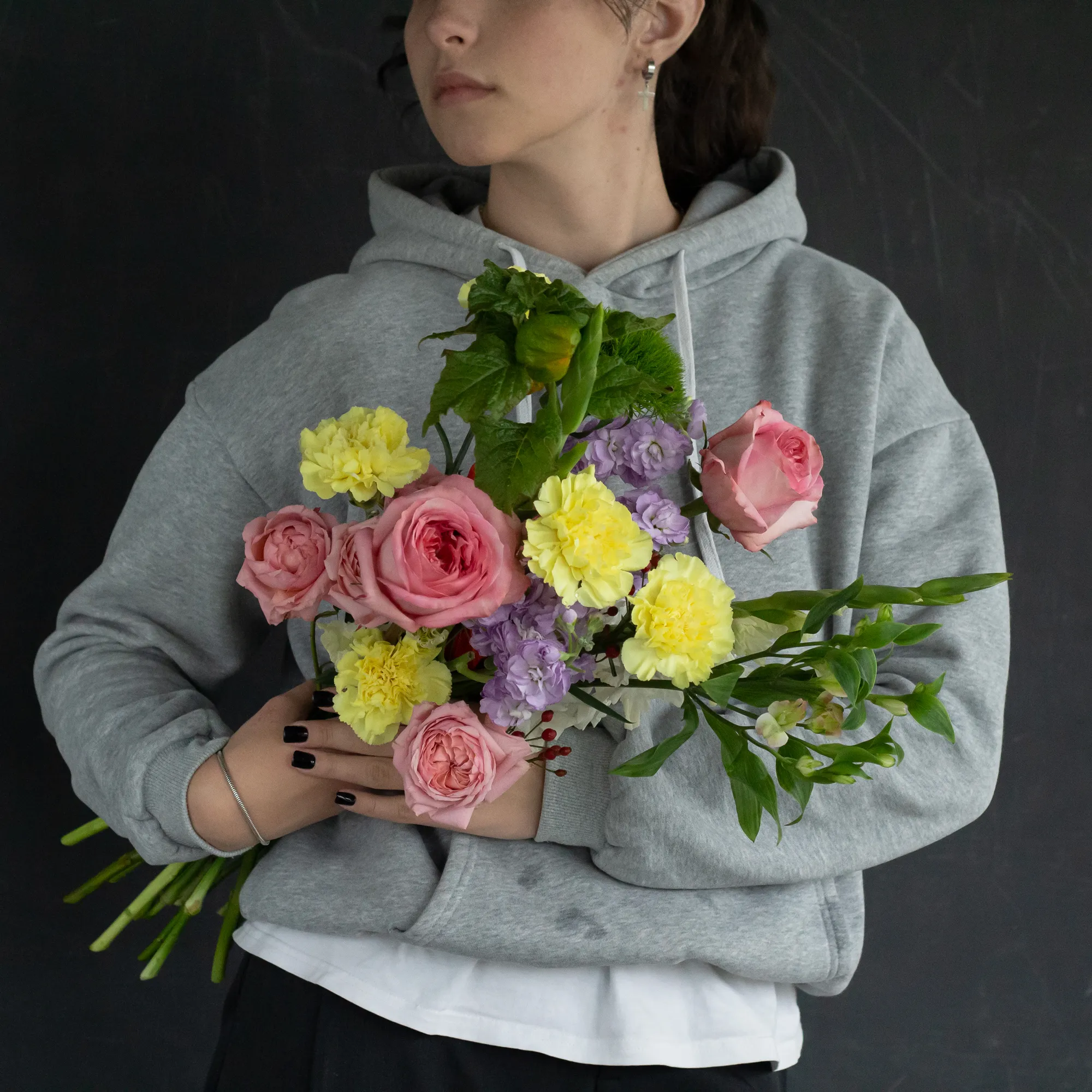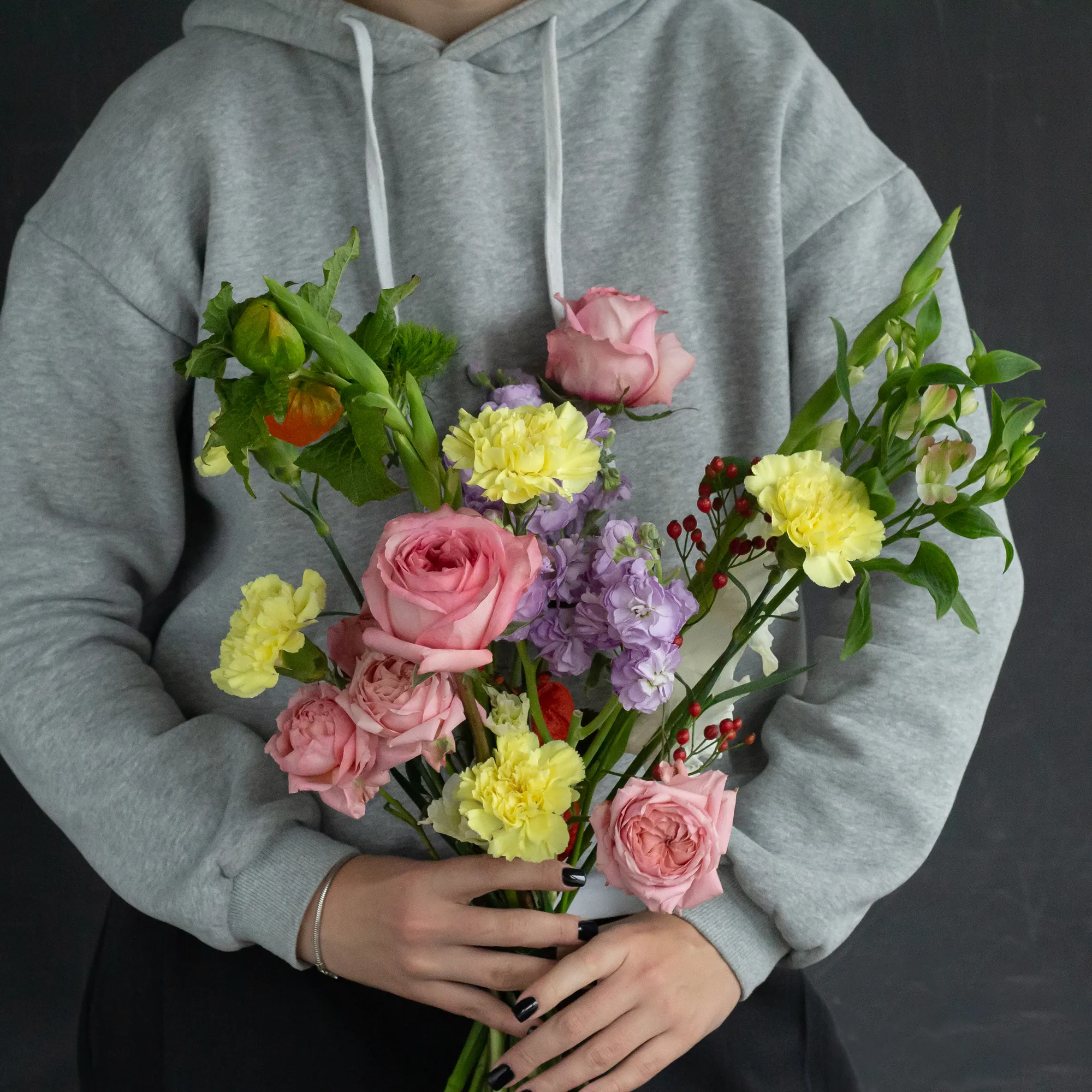 Яркий авторский интерьерный букет с пионовидными розами, гвоздиками, альстромерией и матиолой