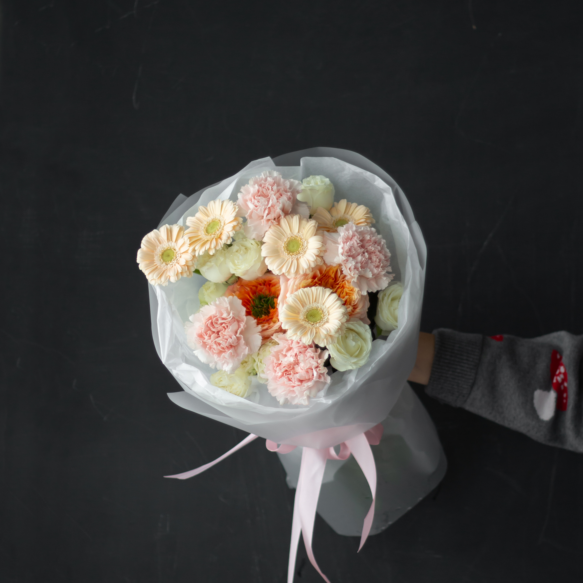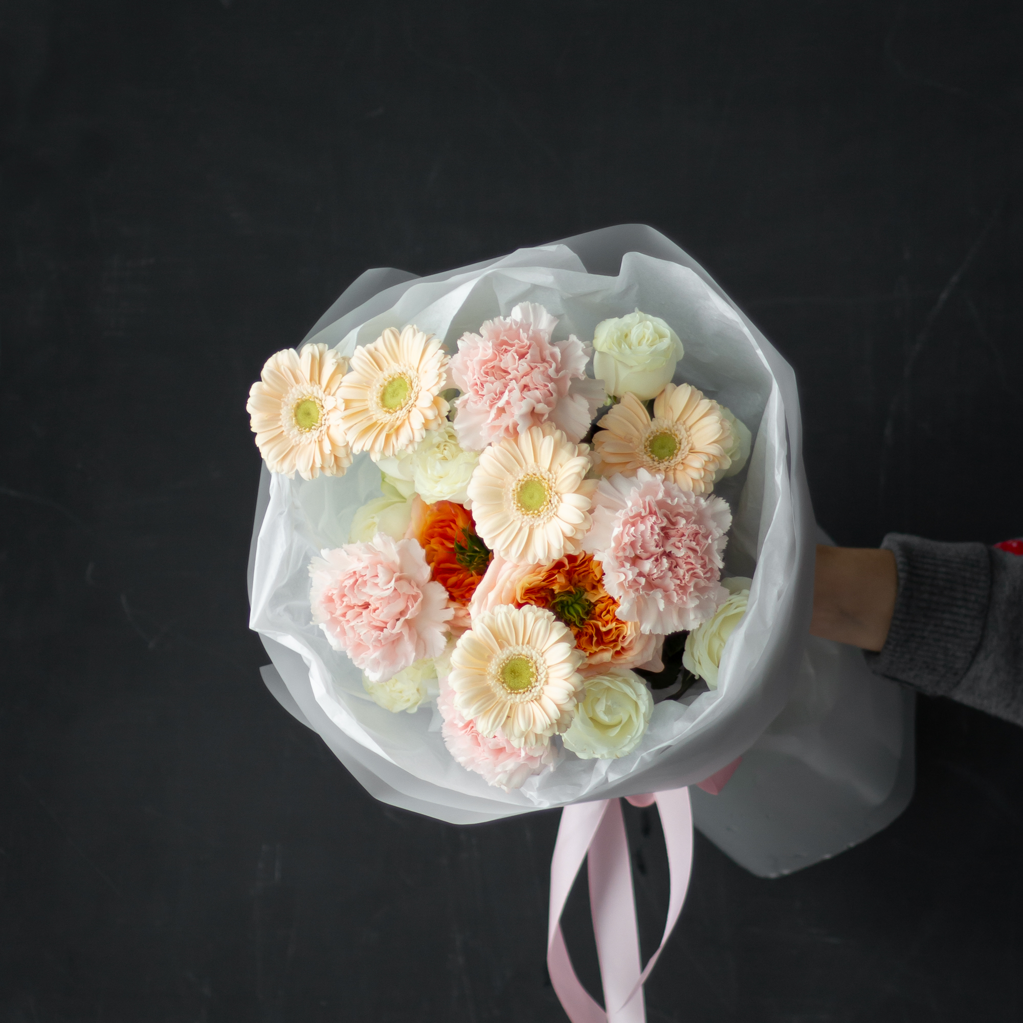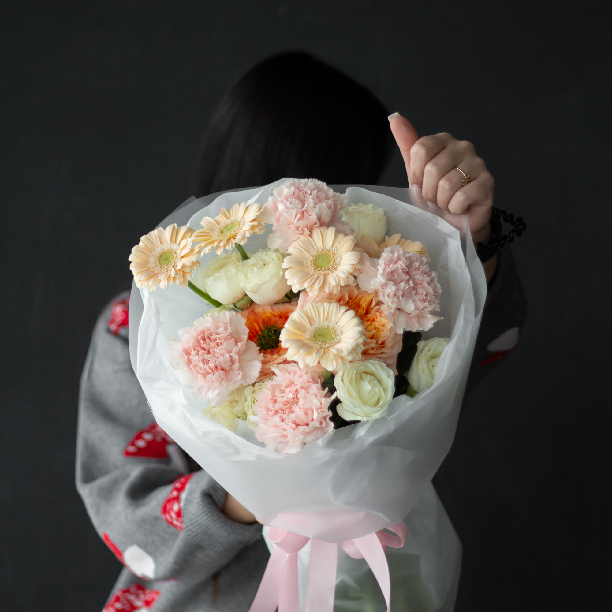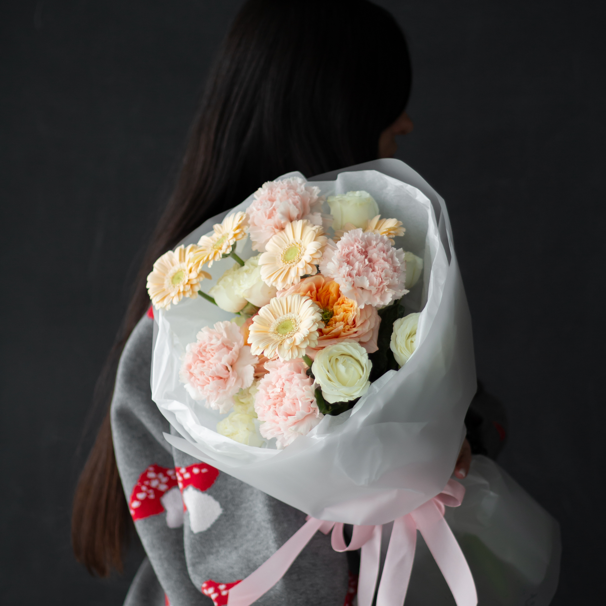 Нежный авторский букет с пионовидными розами, герберой и гвоздикой