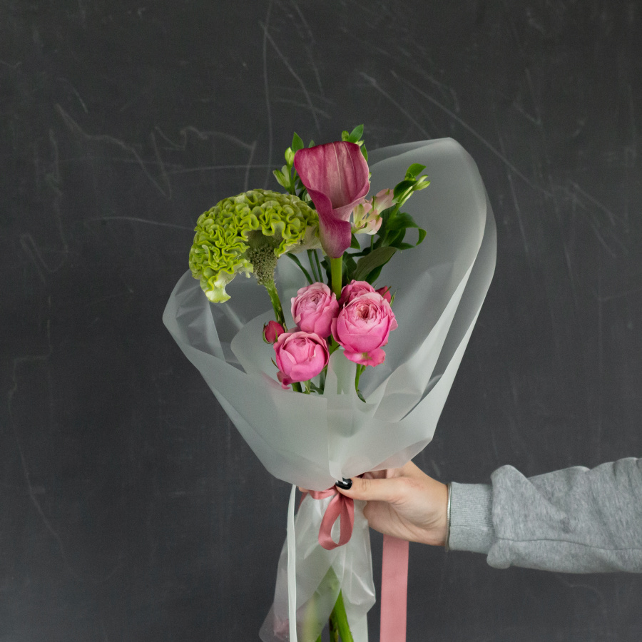 Яркий небольшой авторский букет с пионовидными розами, каллой, целлозией и альстромерией