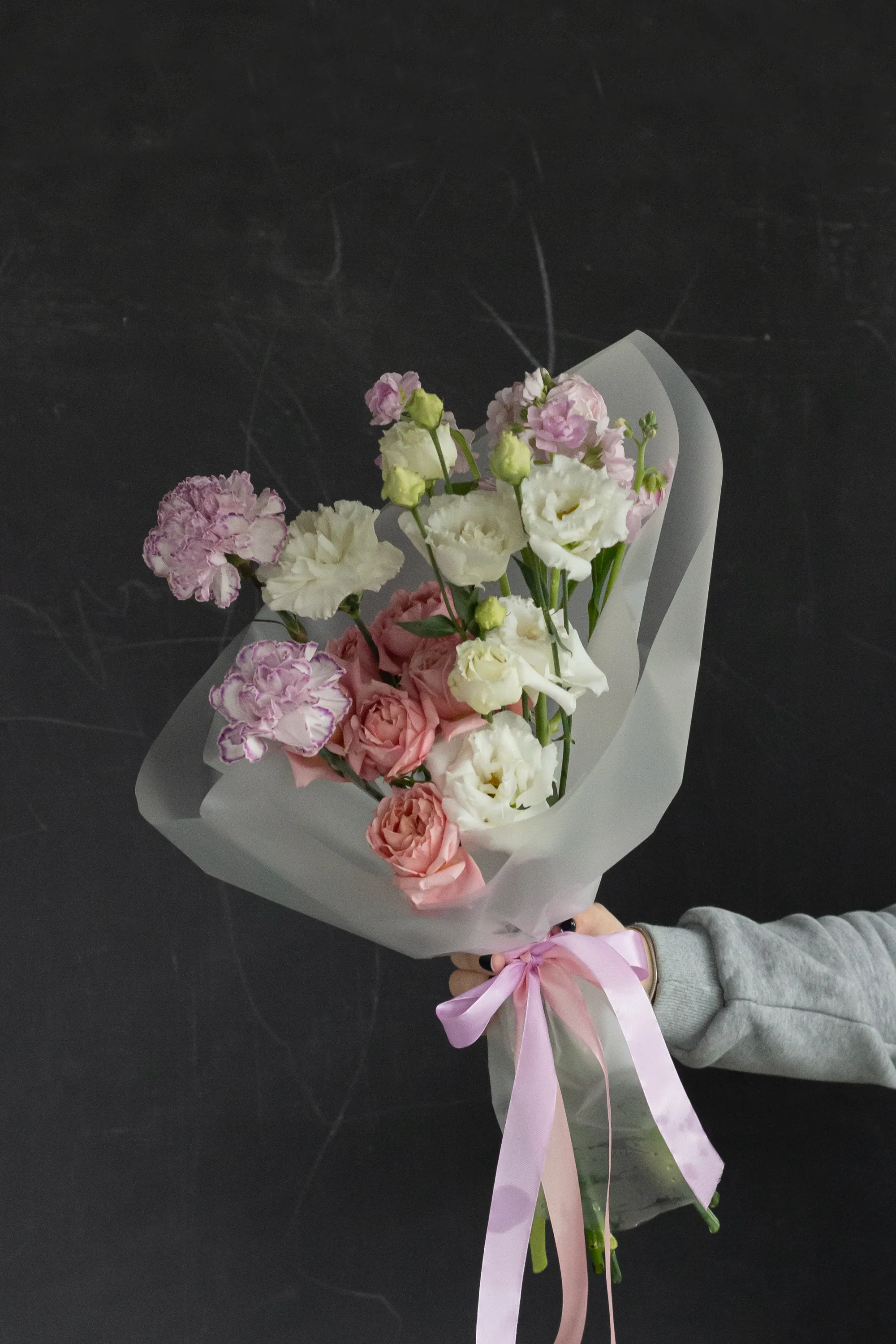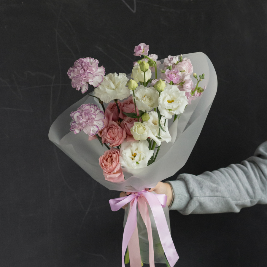 Небольшой нежный авторский букет с пионовидными розами, гвоздиками и эустомой