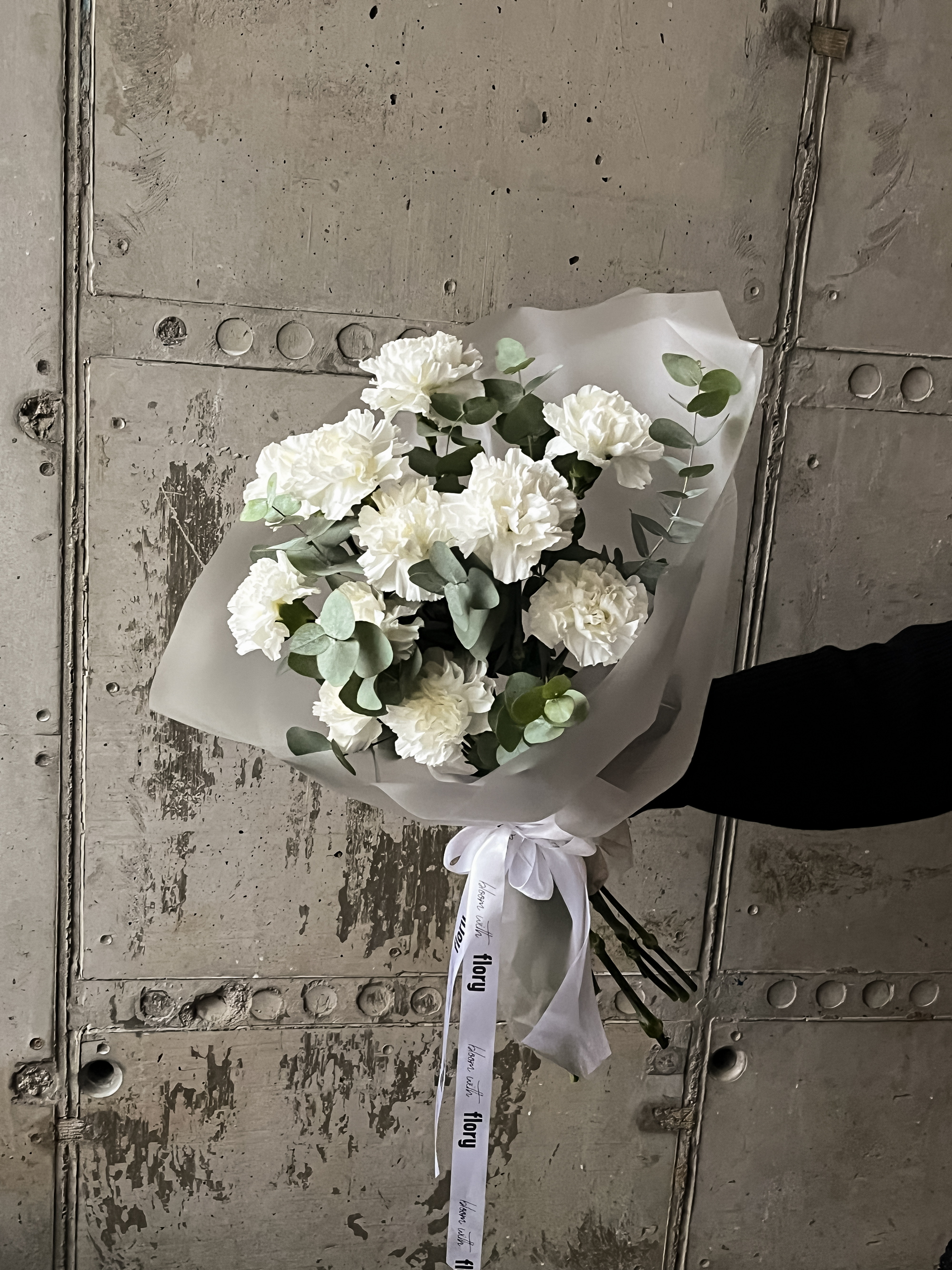 Монобукет белоснежных диантусов с добавлением эвкалипта