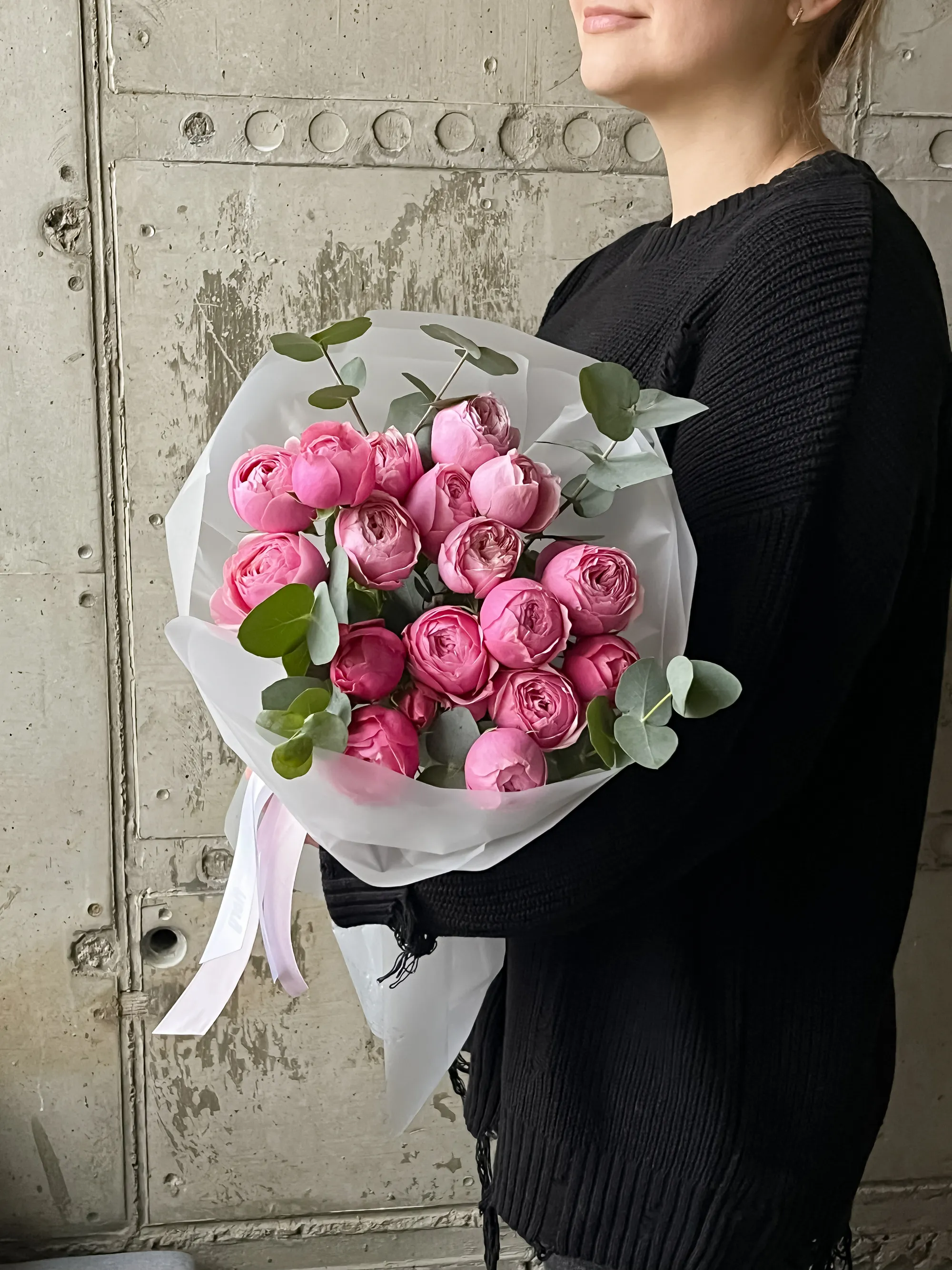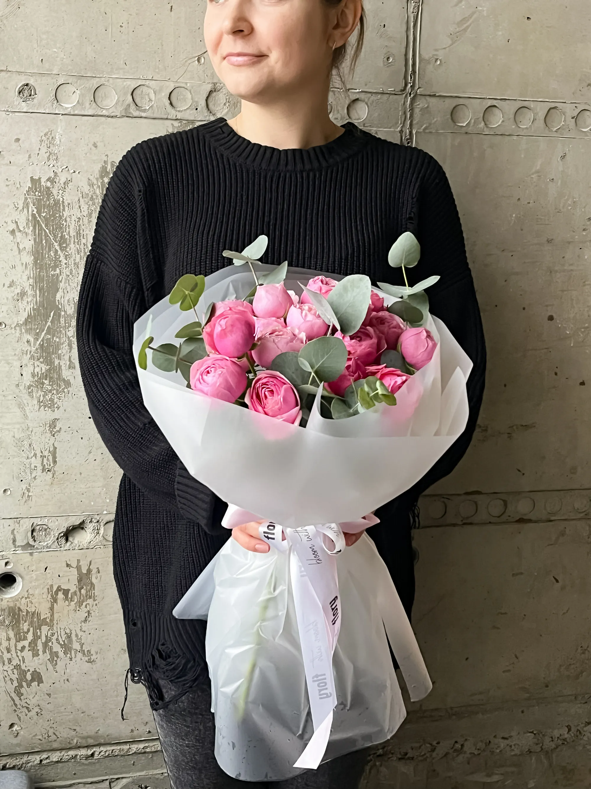 Монобукет пионовидных роз Сильвия Пинк с добавлением эвкалипта