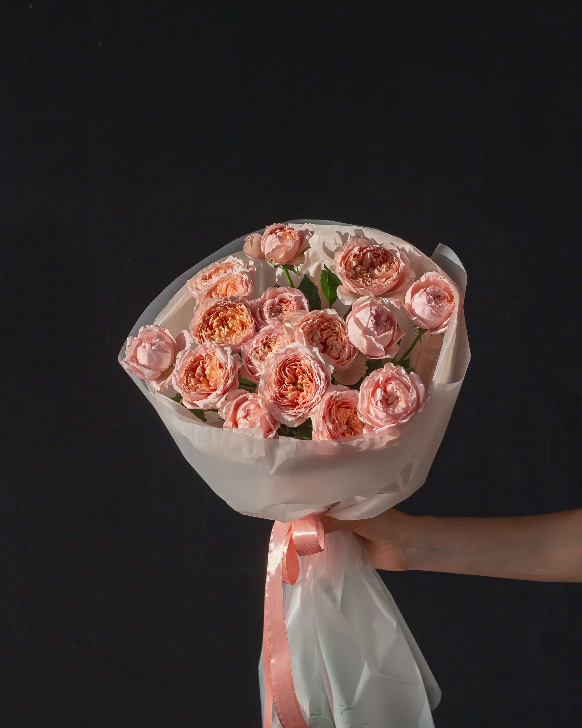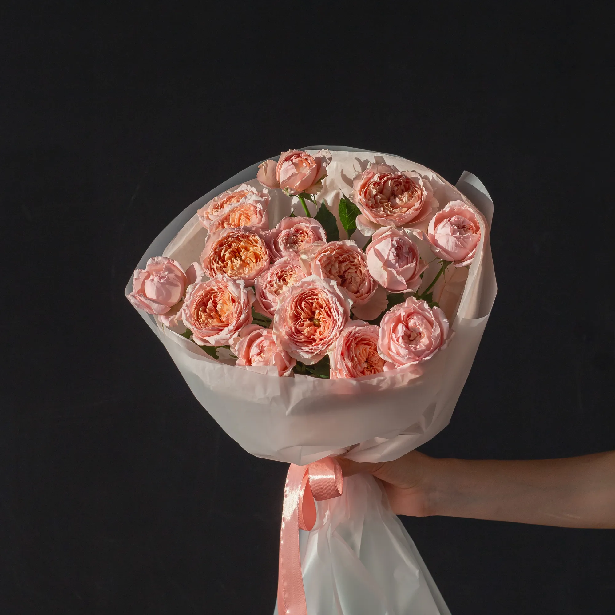 Небольшой монобукет пионовидных кустовых роз сорта Джульетта