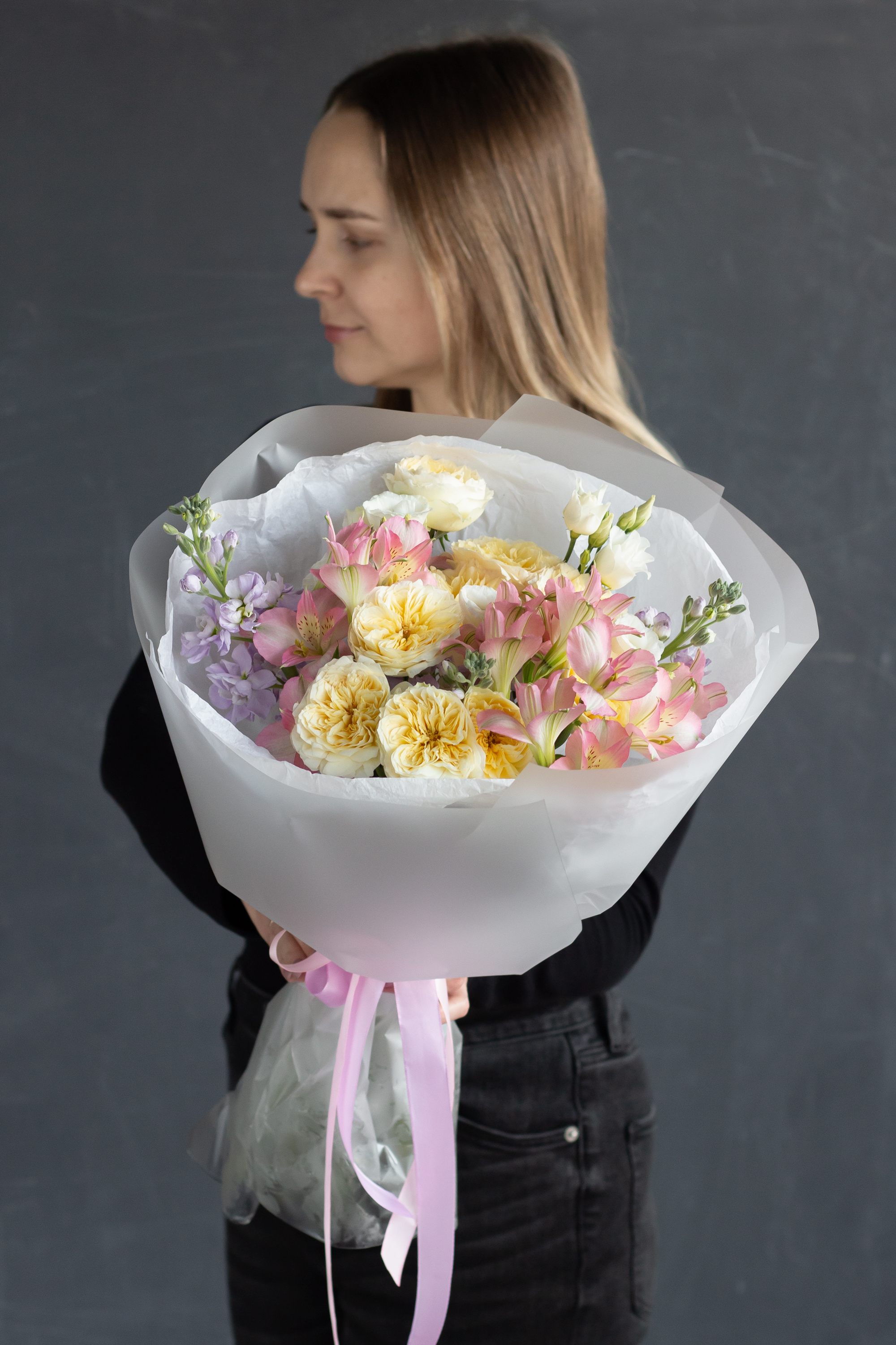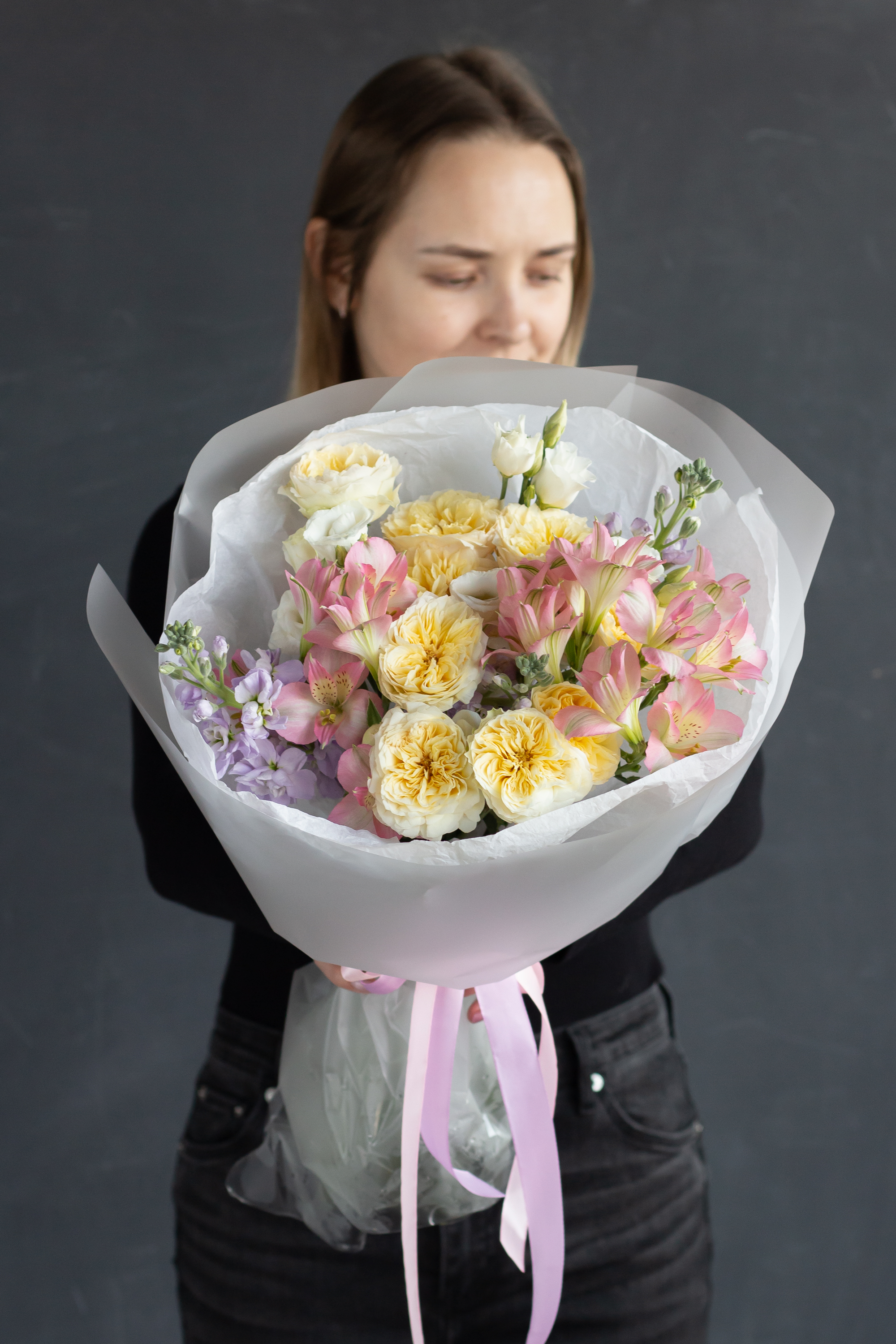 Внимание: букет содержит сезонные цветы, которые могут быть заменены на идентичные по форме и цвету.